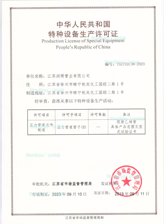 在各部門齊心協力下,歷經了數個月予2019年9月11日,我公司通過江蘇省市場監督管理局審查,取得了《特種設備生產許可證》(壓力管道元件)。填補了潤碩之前壓力管道元件制造資質的空白,為公司承接城鎮燃氣管道生產供應邁出了堅實的一步。